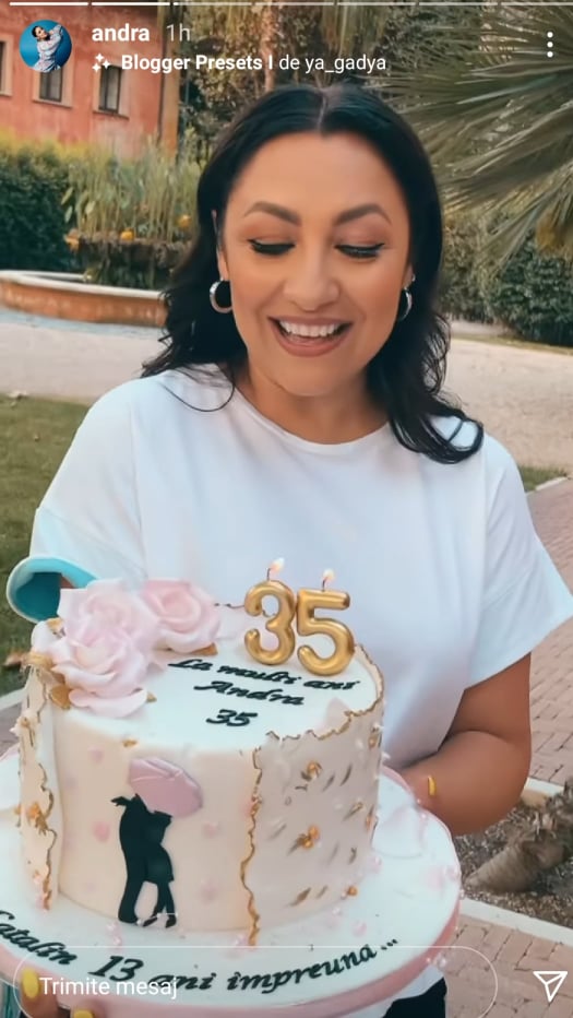 ”De azi-noapte, de la 12, am început să primesc foarte multe mesaje. Și am primit cadouri de la copilașii mei. Am fost foarte bucuroasă și emoționată. Nu știu când au trecut anii ăștia, dar au trecut foarte frumos și alături de oameni minunați, care sunt alături de mine mereu. Vă pup și vă iubesc pe toți și vă mulțumesc pentru toate mesajele pe care le primesc”, a spus Andra la InstaStory.