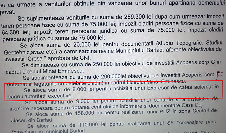 În timp ce primarii din majoritatea comunelor spun că nu există fonduri pentru animite reabilitări, primarul din Bârlad a găsit fonduri pentru a-și cumpăra un expresor foarte scump.