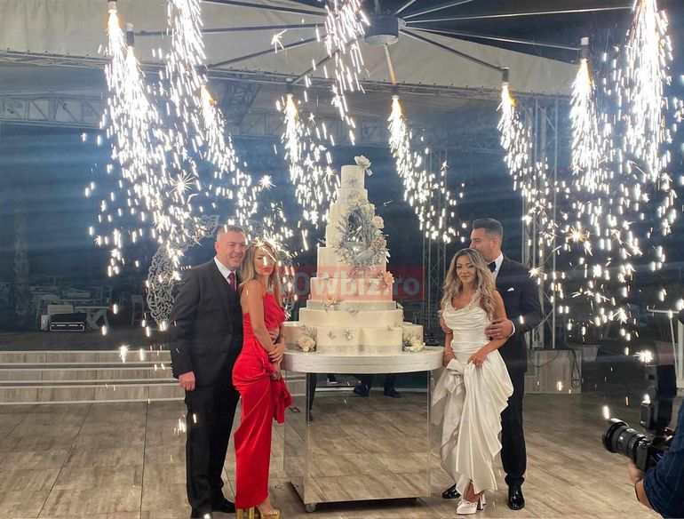 După acest moment extrem de emoționant a urmat tăierea tortului de 8 etaje și focul de artificii. Mirii și nașii au tăiat împreună tortul, iar apoi au continuat petrecerea.