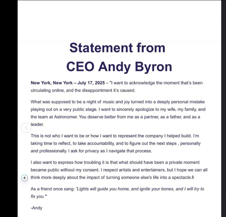 Scuzele cerute de CEO au apărut online joi, provocând agitație pe rețelele sociale: „ Vreau să recunosc momentul care a circulat online și dezamăgirea pe care a provocat-o- ceea ce trebuia să fie o noapte de muzică și bucurie s-a transformat într-o greșeală profund personală, desfășurată pe o scenă foarte publică.