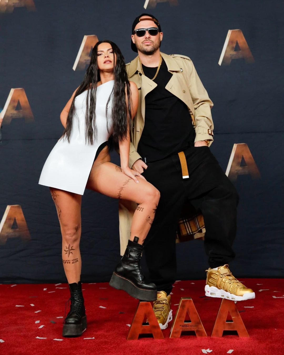 Inna a purtat o rochie albă, mulată, pe care a asortat-o cu o pereche de ghete negre, îm timp ce nașul, Deliric a optat pentru ținută mai lejeră, purtând o cămașă cu motive florale, pantaloni scurți de culoare închisă și o pereche de teniși.