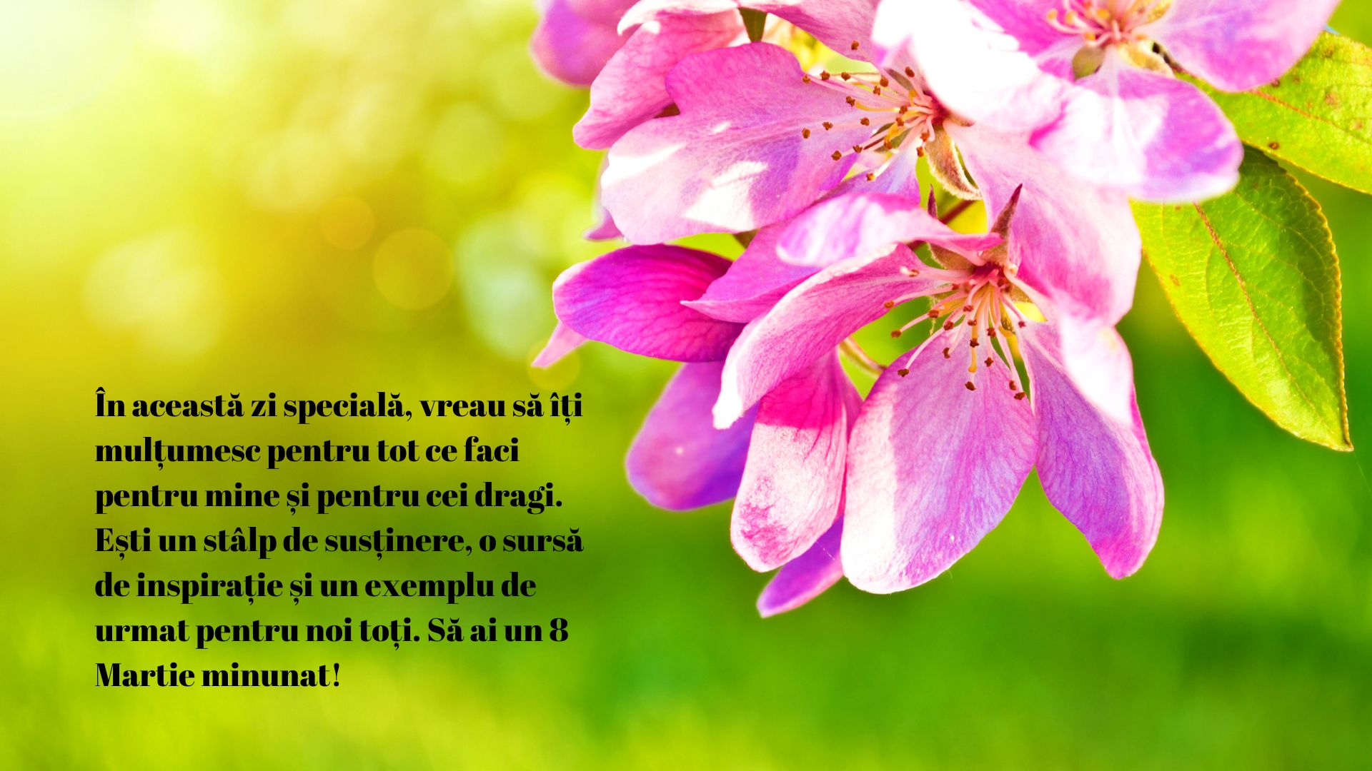 „Fiecare zi este specială alături de tine, dar 8 Martie este o adevărată sărbătoare! Îți mulțumesc pentru toată dragostea, înțelepciunea și grijile pe care le arăți față de mine și față de cei dragi. Să ai un 8 Martie minunat!”