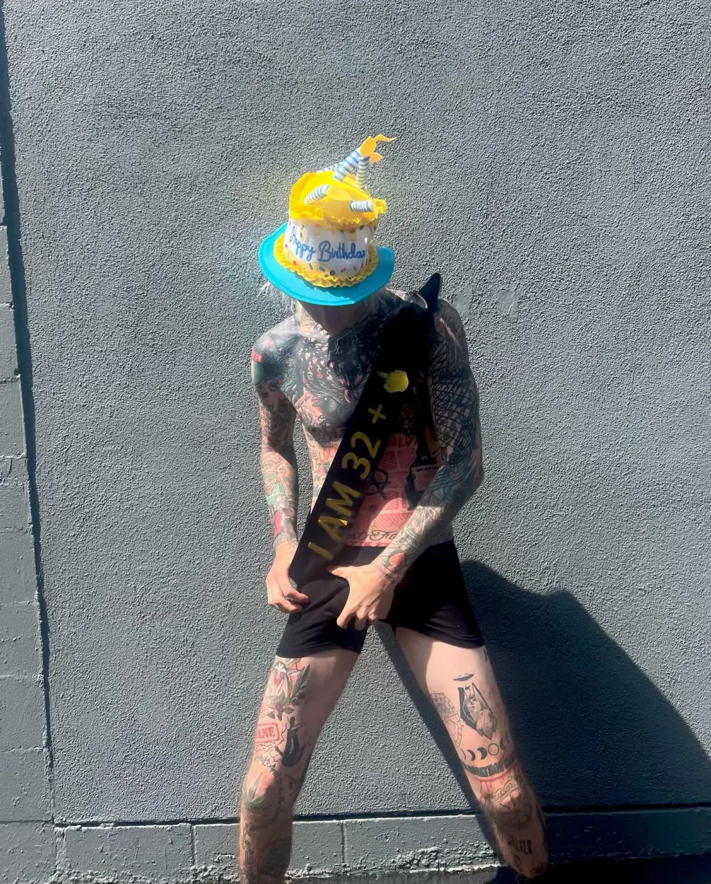Într-una dintre fotografii, MGK – al cărui nume real este Colson Baker – stătea în fața unui tort cu glazuă roz cu negru pe care era imprimată imaginea uneia dintre pisicile sale. Într-o altă poză „Bloody Valentine” a pozat afară doar în boxeri, o pălărie în formă de tort și o eșarfă pe care scria „Am 32 de ani +”.