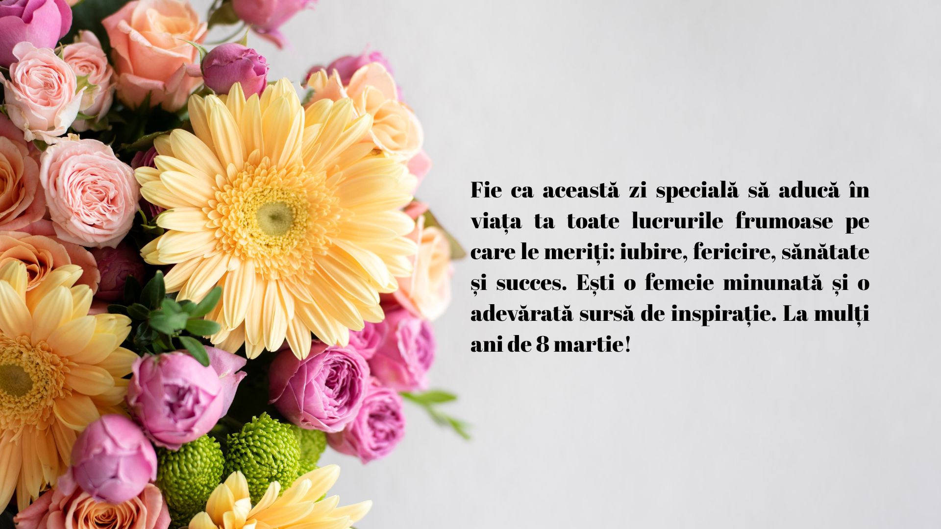 „La mulţi ani de 8 Martie! Îţi doresc ca aceste zile de primăvară să-ţi împlinească visele alături de cei dragi și să îți aducă multă dragoste!”