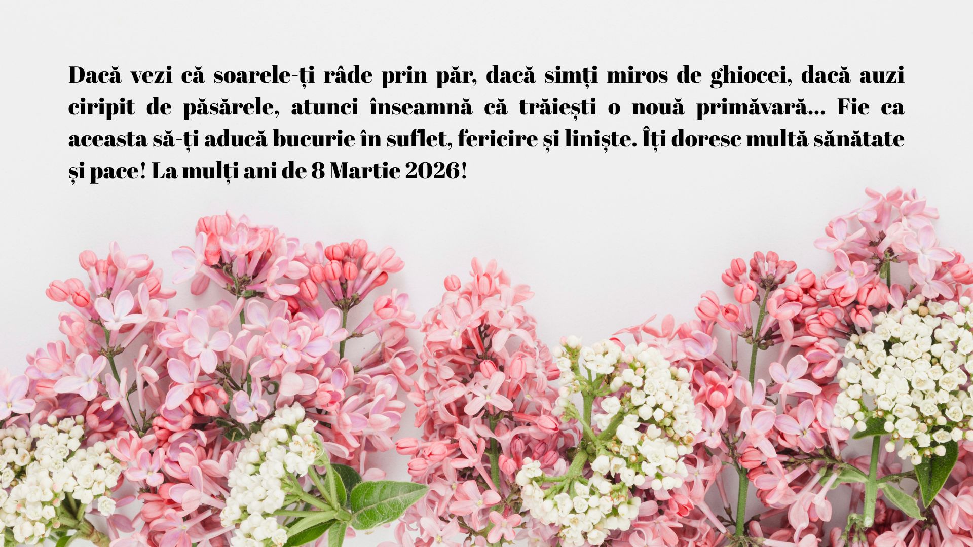 Vă doresc un 8 Martie cât mai frumos!”„Dacă vezi că soarele-ţi râde prin păr, dacă simţi miros de ghiocei, dacă auzi ciripit de păsărele, atunci înseamnă că trăieşti o nouă primăvară… Fie ca aceasta să-ţi aducă bucurie în suflet, fericire şi linişte. Îţi doresc multă sănătate şi pace! La mulți ani de 8 Martie 2026!”