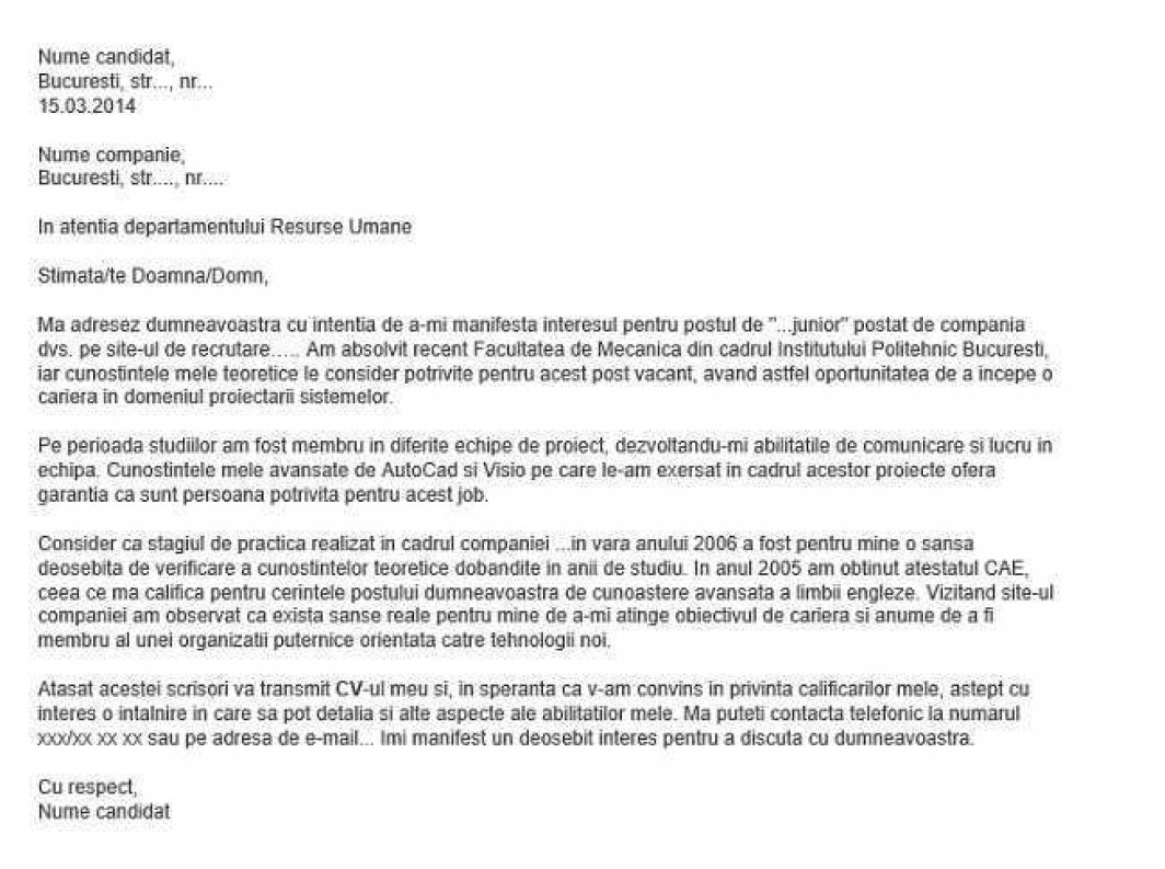 Este necesar să dai detalii despre abilităţile şi experienţa ta, dar şi să îi exemplifici angajatorului cum te-ai putea plia pe viziunea companiei. În final, îi poţi mulţumi angajatorului că şi-a răpit din timp pentru a citi scrisoarea şi poţi scrie că aştepţi cu mare interes in răspuns. Scrisoarea se poate încheia cu "Gânduri bune", urmat de numele tău complet.