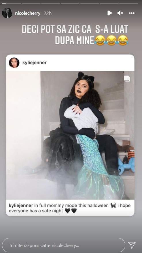 „ Unii n-aveți simțul umorului. Doamne ferește! Cum să credeți vreodată în viața asta că Kylie Jenner s-ar uita la oricine din România să se inspire pentru Halloween?! Era o glumă, o coincidență amuzantă, drăguță. Mă doare așa de tare capul și m-am enervat când am citit. Fix la mine se uita Kylie” , a spus Nicole Cherry, pe InstaStory.