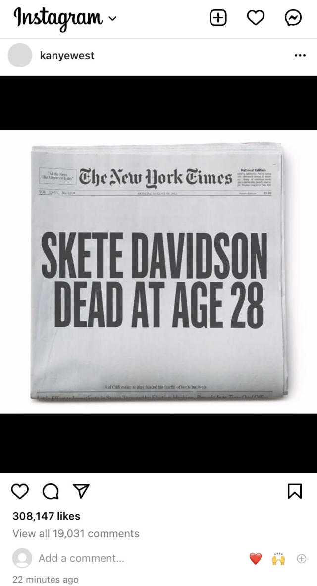 Imediat după aflarea despărțirii, Kanye West a profitat de moment pentru a posta un nou mesaj acid la adresa lui Pete Davidson. Rapper-ul american a postat pe pagina sa de Instagram o fotografie editată drept o pagină din New York Times, pe care scrie cu majuscule: „Skete Davidson, mort la vârsta de 28 de ani”