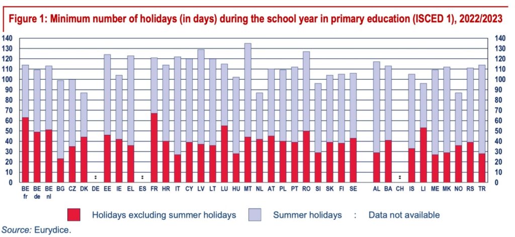 România se menține în rândul țărilor europene cu cele mai puține zile din an dedicate școlii, reiese dintr-un raport privind organizarea anului școlar publicat în urmă cu câteva zile de rețeaua europeană Eurydice. Acesta arată că, la nivelul școlii primare, țara noastră este pe locul trei, după Malta și Letonia, în rândul țărilor cu cele mai multe zile de vacanță în acest an școlar, depășind inclusiv numeroase țări din sudul continentului, care, din rațiuni geografice și economice, au vacanțe de vară mai lungi.