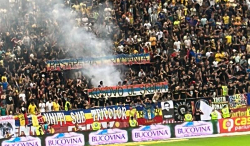 "În legătură cu meciul de fotbal ROMÂNIA- KOSOVO, Direcția Generală de Jandarmi a Municipiului București face următoarele precizări: Pe timpul desfășurării partidei de fotbal, mai mulți membri ai unei facțiuni autointitulate de tip "ultras" au folosit materiale pirotehnice interzise, au adresat injurii oaspeților, au afișat un banner cu mesajul "Kosovo je Serbija" și au scandat același mesaj. În urma acestor acțiuni, arbitrul a decis întreruperea meciului pe o perioadă nedeterminată, urmând a fi luate decizii în consecință. Reprezentanții autorităților implicate în organizarea și gestionarea evenimentului sportiv au purtat discuții cu suporterii gazdă pentru a-i determina să se delimiteze de aceste acțiuni ilegale, iar partida s-a reluat, fiind impusă de către oficiali condiția ca aceste comportamente ilicite să înceteze. În cazul în care suporterii vor refuza să se conformeze celor menționate, arbitrii vor decide asupra desfășurării partidei de fotbal, existând riscul pierderii acesteia la masa verde. Subliniem faptul că, potrivit prevederilor art. 10, alin. 2, lit. a), din Legea nr. 4 din 2008 privind prevenirea și combaterea violenței cu ocazia competițiilor și ajocurilor sportive, cu modificările și completările ulterioare, răspunderea pentru efectuarea unui control riguros al persoanelor și al bagajelor acestora, în scopul împiedicării introducerii în stadion a unor obiecte, materiale sau mesaje interzise revine organizatorului jocului sportiv", a transmis Jandarmeria.
