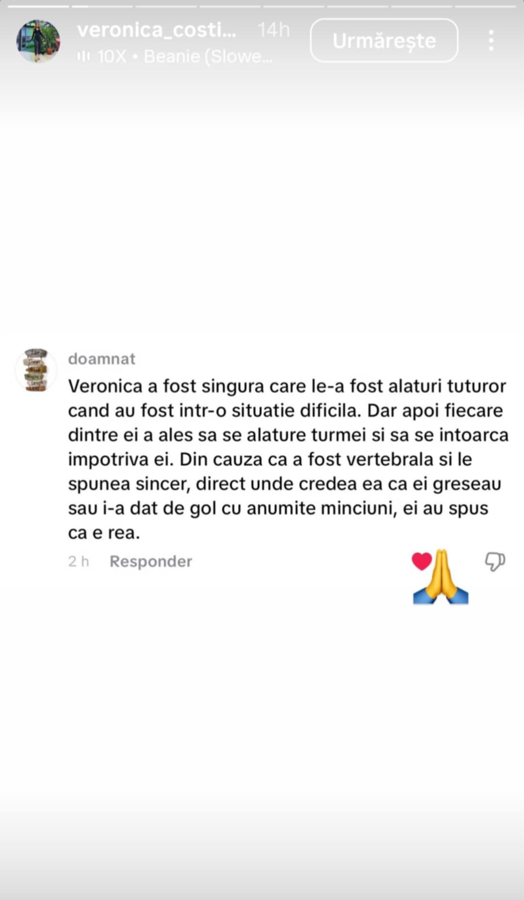 Veronica nu a ezitat s ă posteze mesajul la Instastory, mulțumindu-i public și arătându-le urmăritorilor s ă i c ă gesturile de acest fel î i dau putere s ă continue parcursul î n Casa Iubirii, indiferent de hate-ul pe care îl primește